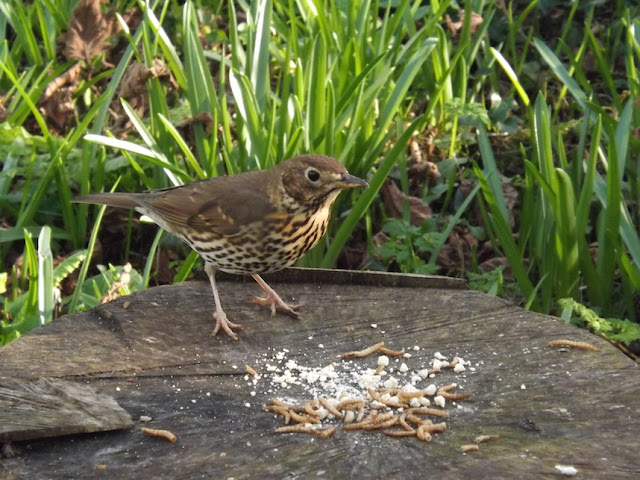 This little one below, has become very brave and perches within 12 inches from me to have daily treats upon the wood stump. Mr blackbird is not very happy about this and often chases her off. I'm calling her a 'her', but in all honesty she could be a 'he' as with song thrushes both sexes like robins, are similar I believe?