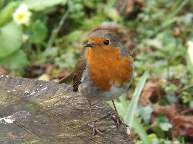 This little one below, has become very brave and perches within 12 inches from me to have daily treats upon the wood stump. Mr blackbird is not very happy about this and often chases her off. I'm calling her a 'her',  but in all honesty she could be a 'he' as with song thrushes both sexes like robins, are similar I believe?