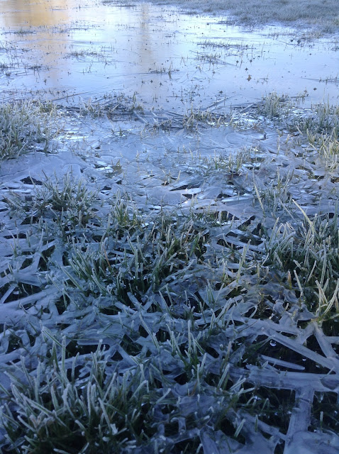 A frosted morning,  clear sky,  noisy rooks. I took the long way home from the post office across the fields. The river had burst it's banks earlier in the week and the fields had turned to lakes. From my window I had imagined I was in Avalon. Now the water had receded leaving shallow still pools.  The sun shone a sparkling path of light across to the other side.