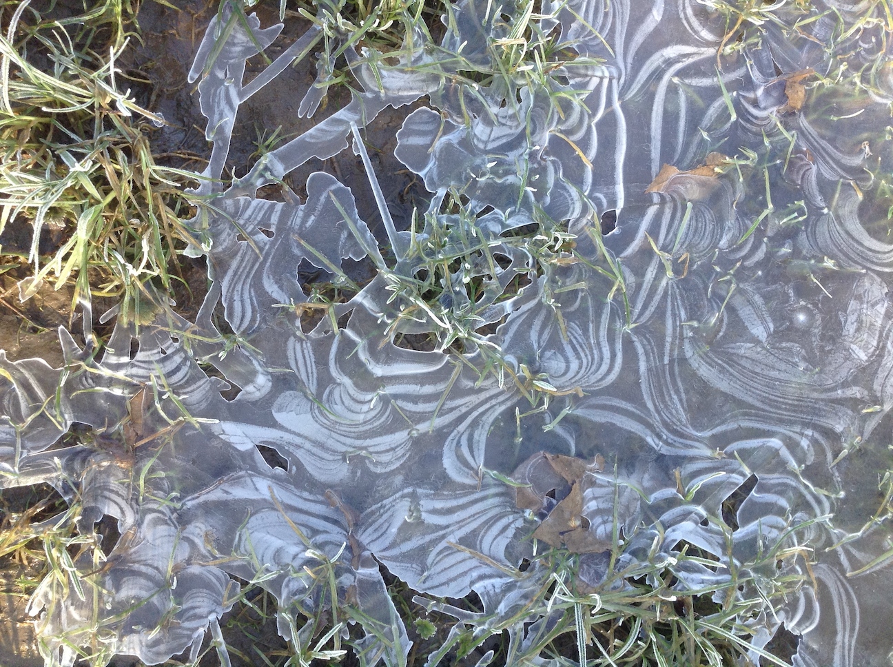 A labyrinth of tiny frozen pathways. Fused shards of water crystal, welded, woven between grass.