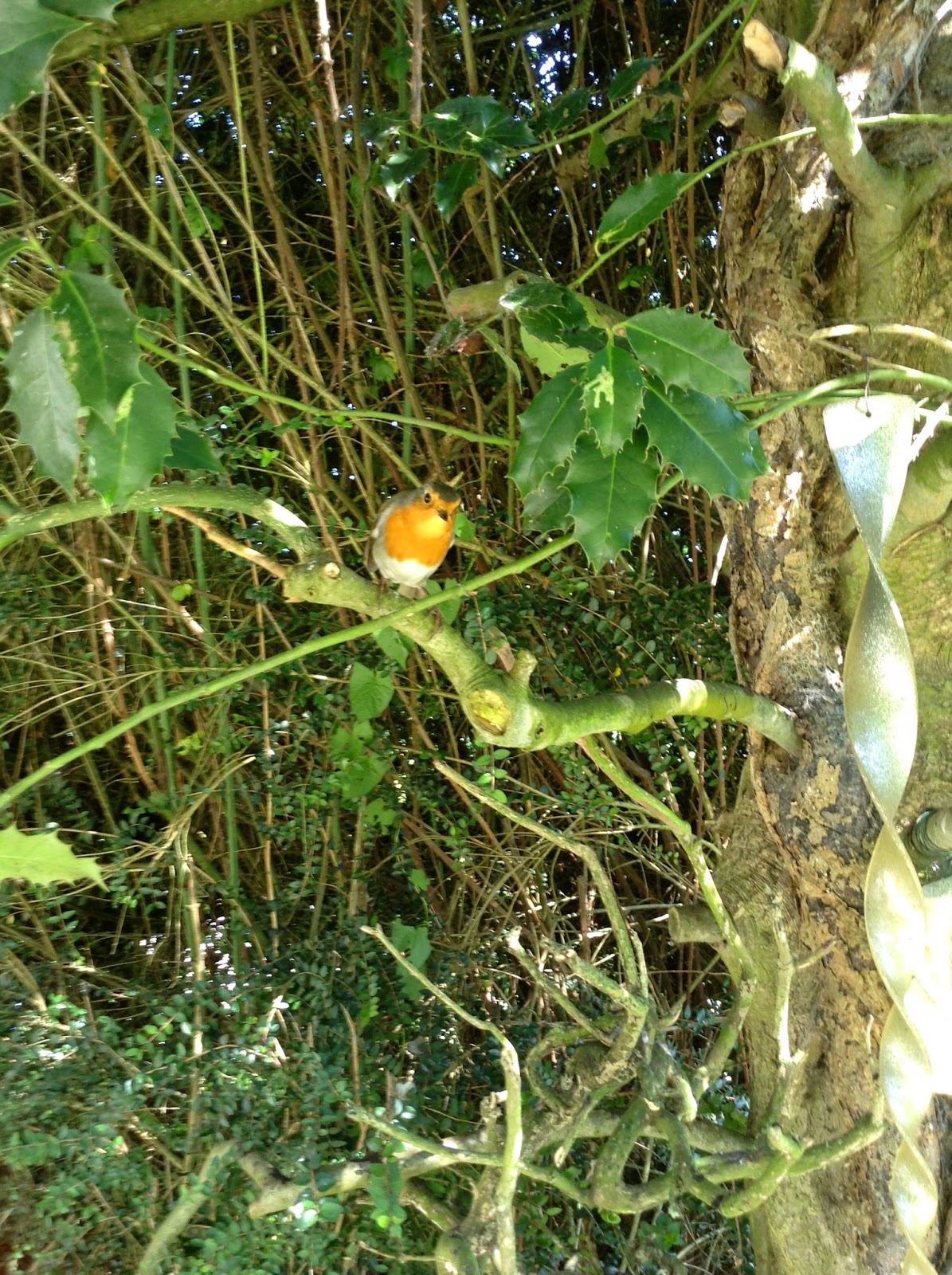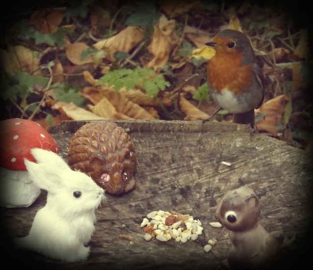 That first week when he disappeared, was it really just my imagination that the birds were singing more loudly as I walked from tree to tree looking for a sign of him. It felt as if they knew and were somehow telling me? The blackbird whom my Robin was often seen with, was perching near to another much younger looking Robin, with looks so similar to a young Robin Goodfellow. Could it be a son that his ebony friend is now keeping a fatherly eye on? I like to think so.