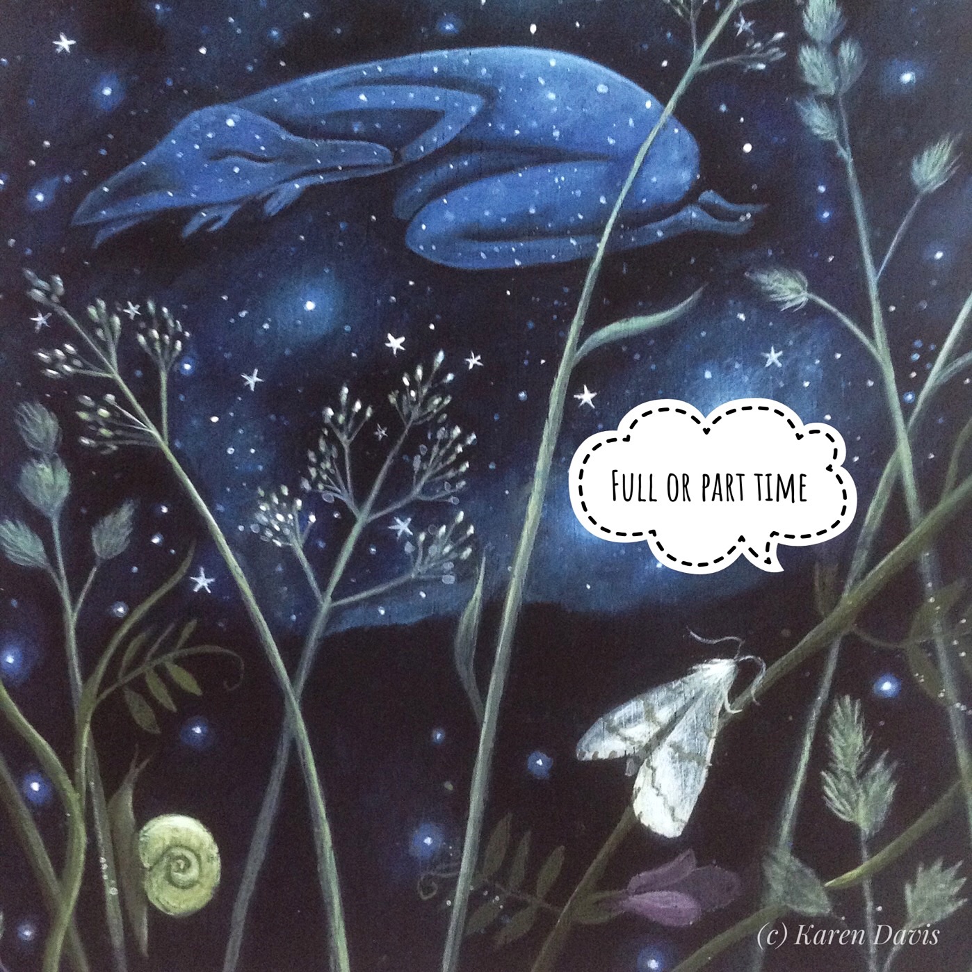 Back in 2008 I began a blog and called it Moonlight and Hares because it was just two things that I loved. I’ve always been in love with the light of the moon and have been drawn to the magical persona that surrounds hares. The name just seemed to stick, although I never officially called my Etsy shop by it and often people get confused a little by that. I kept with my maiden name for Etsy (Karen Davis) because it was what I used for previous freelance work when leaving art college. Now I have my website domain as moonlight and hares and am in the process of getting a shop up and running on there too.